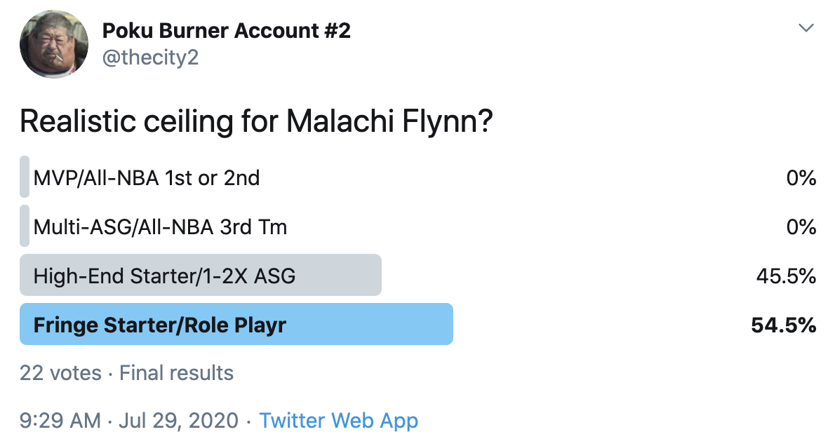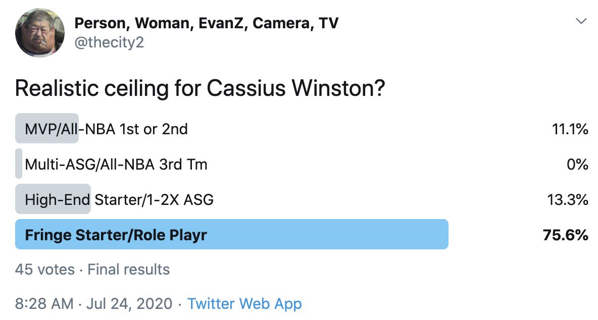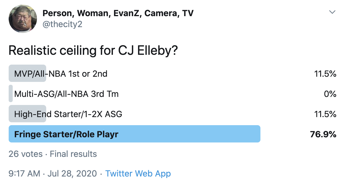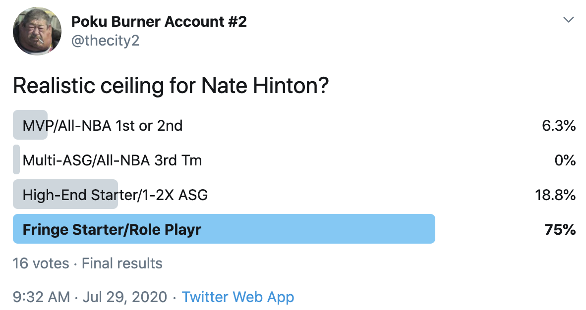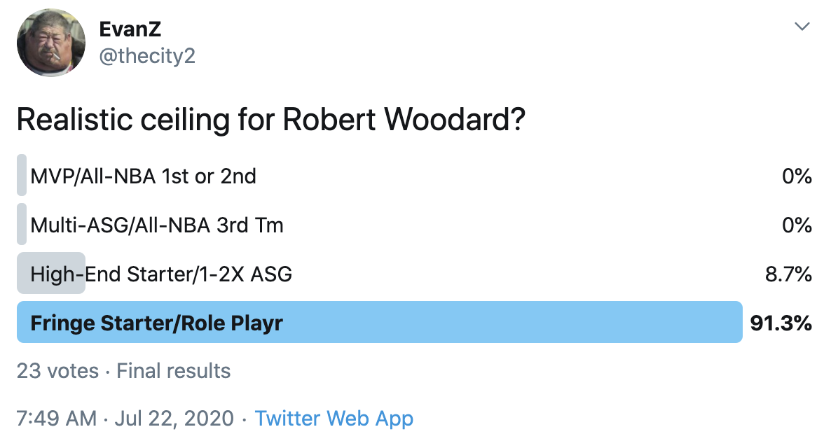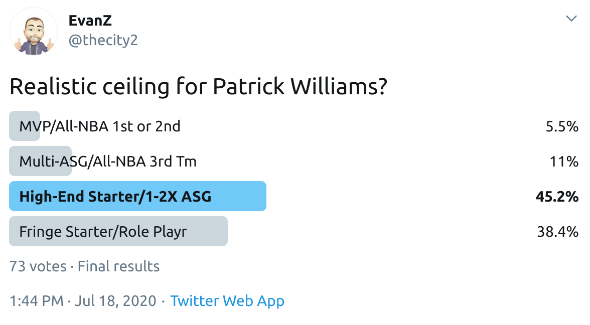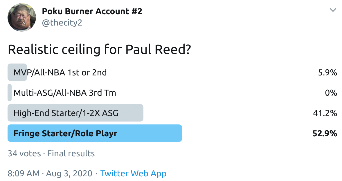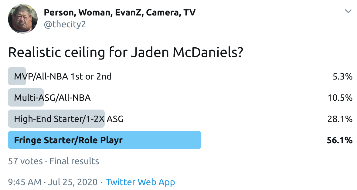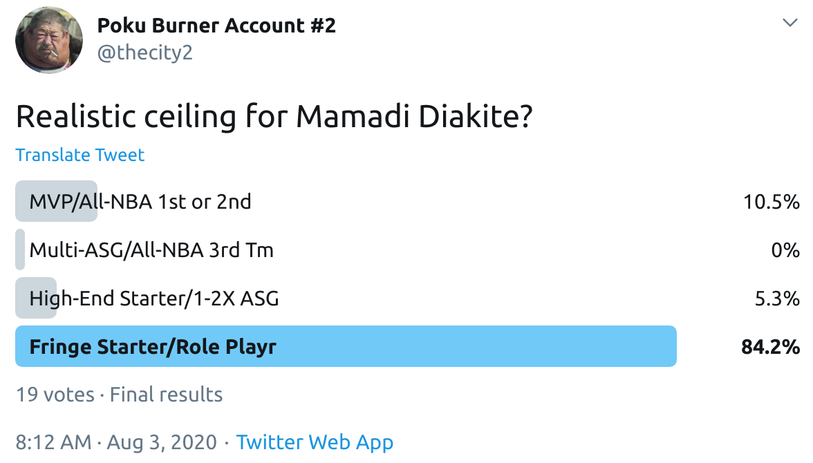 I ran a bunch of polls on Twitter to gauge sentiment on prospects (the poll for LaMelo Ball is shown in the inset). The chart summarizes the results and orders players by an MVP-like voting system which gives 4 points for the top tier, 3 points for the next tier, and so on. Because Twitter limits polls to 4 options, I couldn't fit all 6 of my tier definitions, but this should be a pretty good approximation of #DraftTwitter sentiment (biased of course by my followers). Total votes in parentheses.