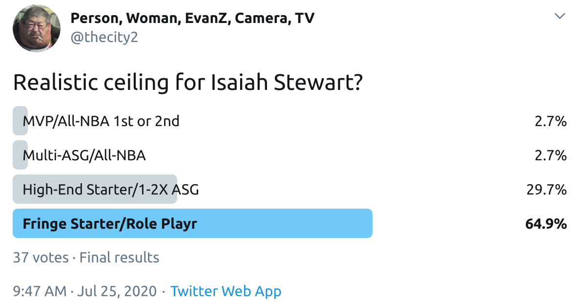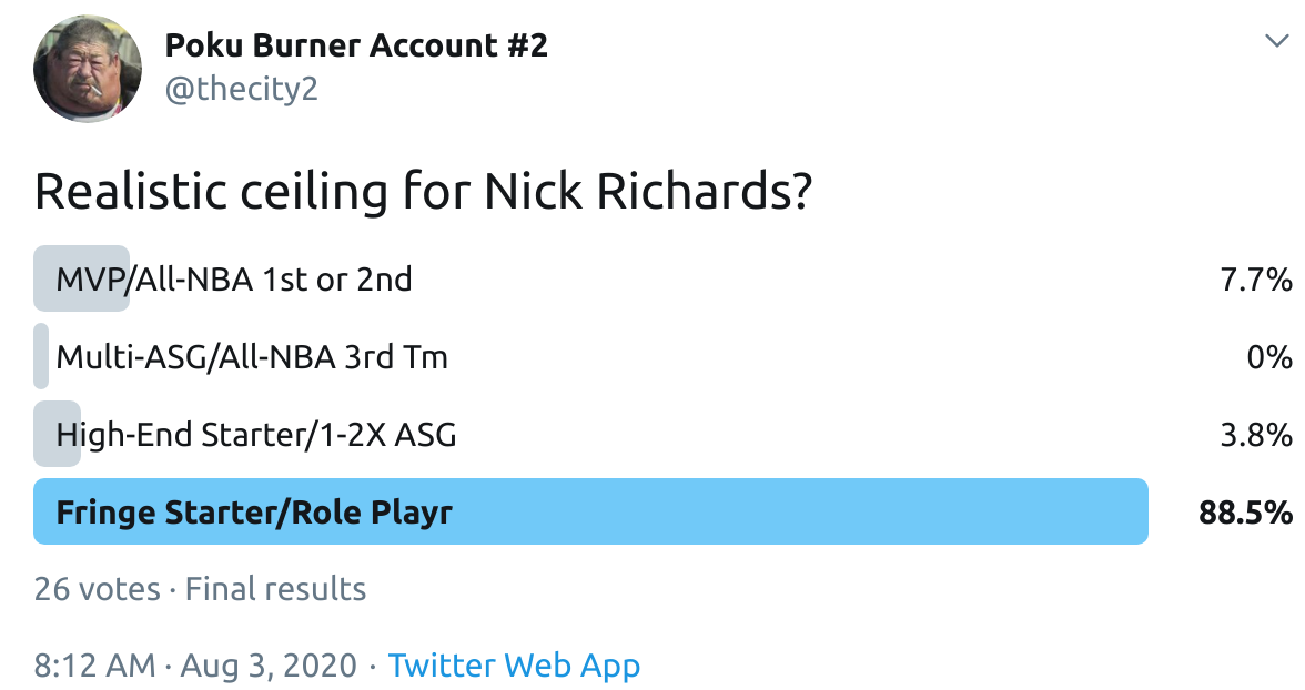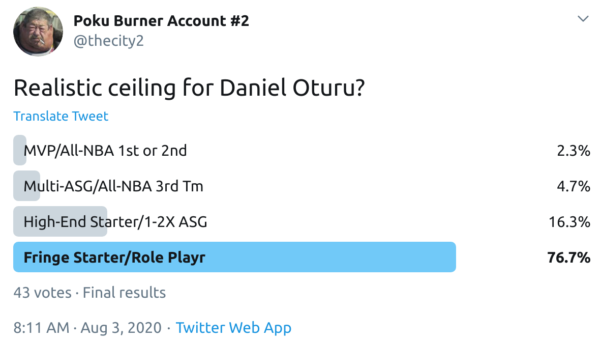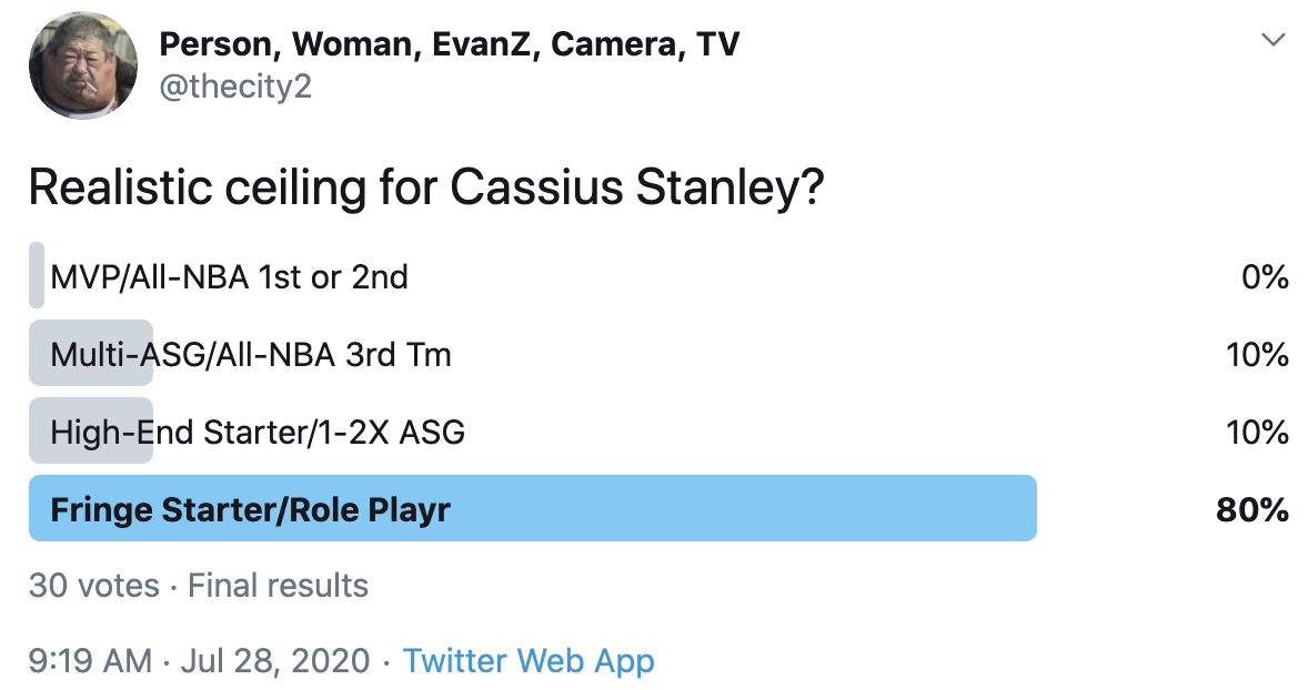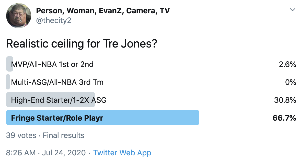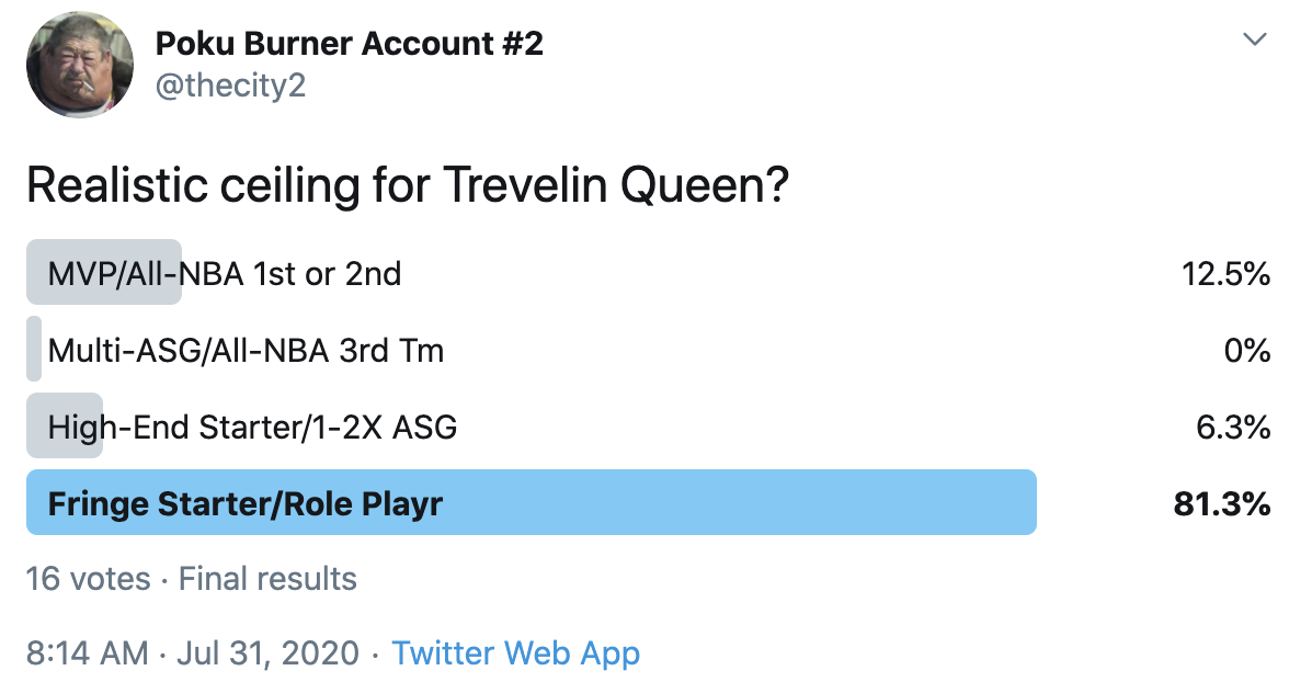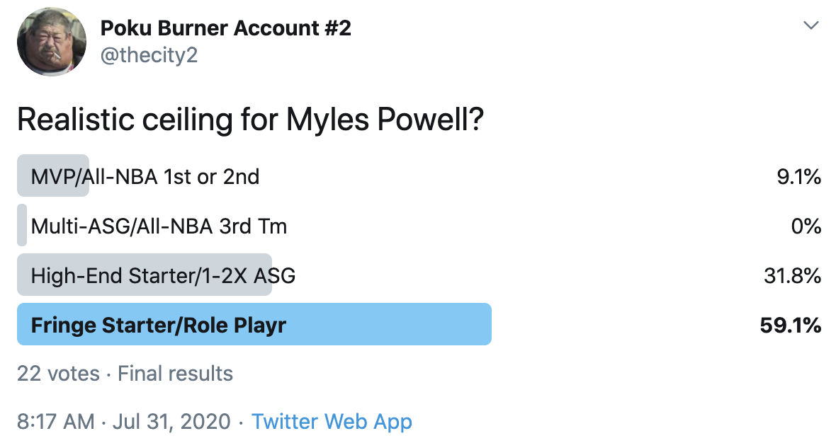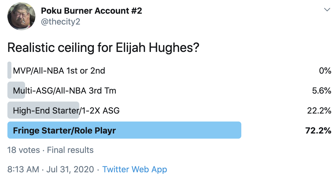 I ran a bunch of polls on Twitter to gauge sentiment on prospects (the poll for LaMelo Ball is shown in the inset). The chart summarizes the results and orders players by an MVP-like voting system which gives 4 points for the top tier, 3 points for the next tier, and so on. Because Twitter limits polls to 4 options, I couldn't fit all 6 of my tier definitions, but this should be a pretty good approximation of #DraftTwitter sentiment (biased of course by my followers). Total votes in parentheses.