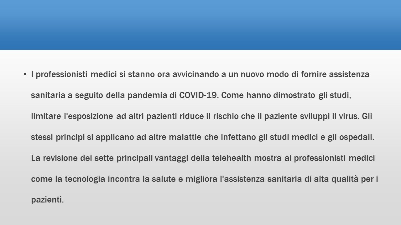 I professionisti medici si stanno ora avvicinando a un nuovo modo di fornire assistenza sanitaria a seguito della pandemia di COVID-19. Come hanno dimostrato gli studi, limitare l'esposizione ad altri pazienti riduce il rischio che il paziente sviluppi il virus. Gli stessi principi si applicano ad altre malattie che infettano gli studi medici e gli ospedali. La revisione dei sette principali vantaggi della telehealth mostra ai professionisti medici come la tecnologia incontra la salute e migliora l'assistenza sanitaria di alta qualità per i pazienti.