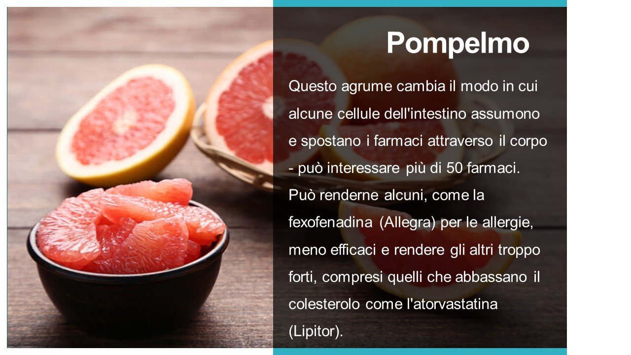 Questo agrume cambia il modo in cui alcune cellule dell'intestino assumono e spostano i farmaci attraverso il corpo - può interessare più di 50 farmaci. Può renderne alcuni, come la fexofenadina (Allegra) per le allergie, meno efficaci e rendere gli altri troppo forti, compresi quelli che abbassano il colesterolo come l'atorvastatina (Lipitor).