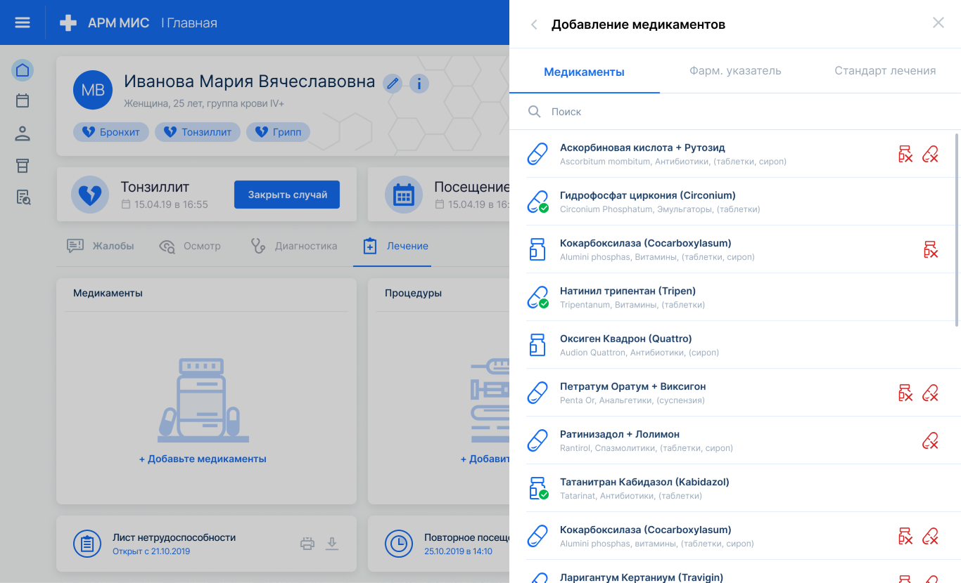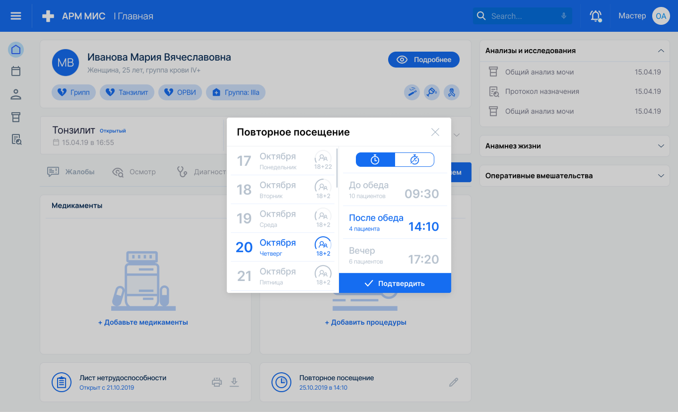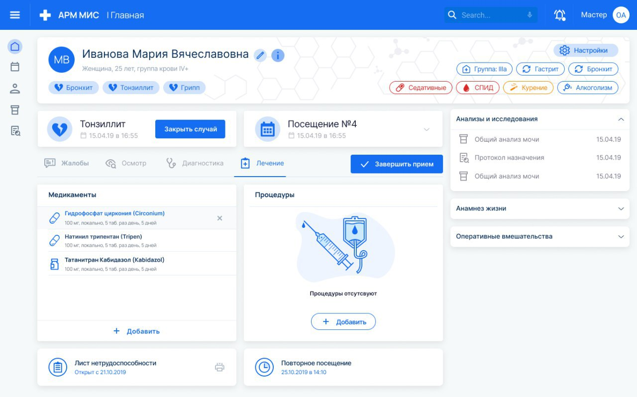 Вместе с повторным посещением, назначением лекарств, выпиской больничного и направлений, внесением всей обязательно информации