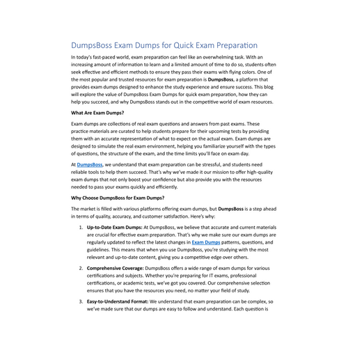 DumpsBoss offers a thorough breakdown of all the key topics covered in each certification exam. This allows you to identify your strengths and weaknesses, prioritize your study areas, and ensure you cover all essential aspects of the exam. The platform’s dumps are categorized into various sections, making it easy to focus on specific subjects that require more attention.