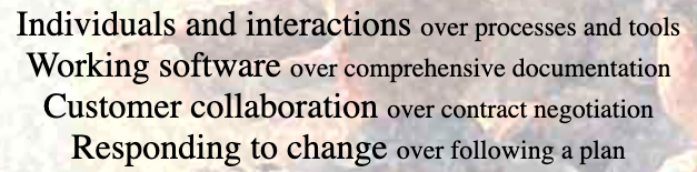 - People and interactions are emphasized rather than process and tools (customers/developer/product/tests are constantly interacting)