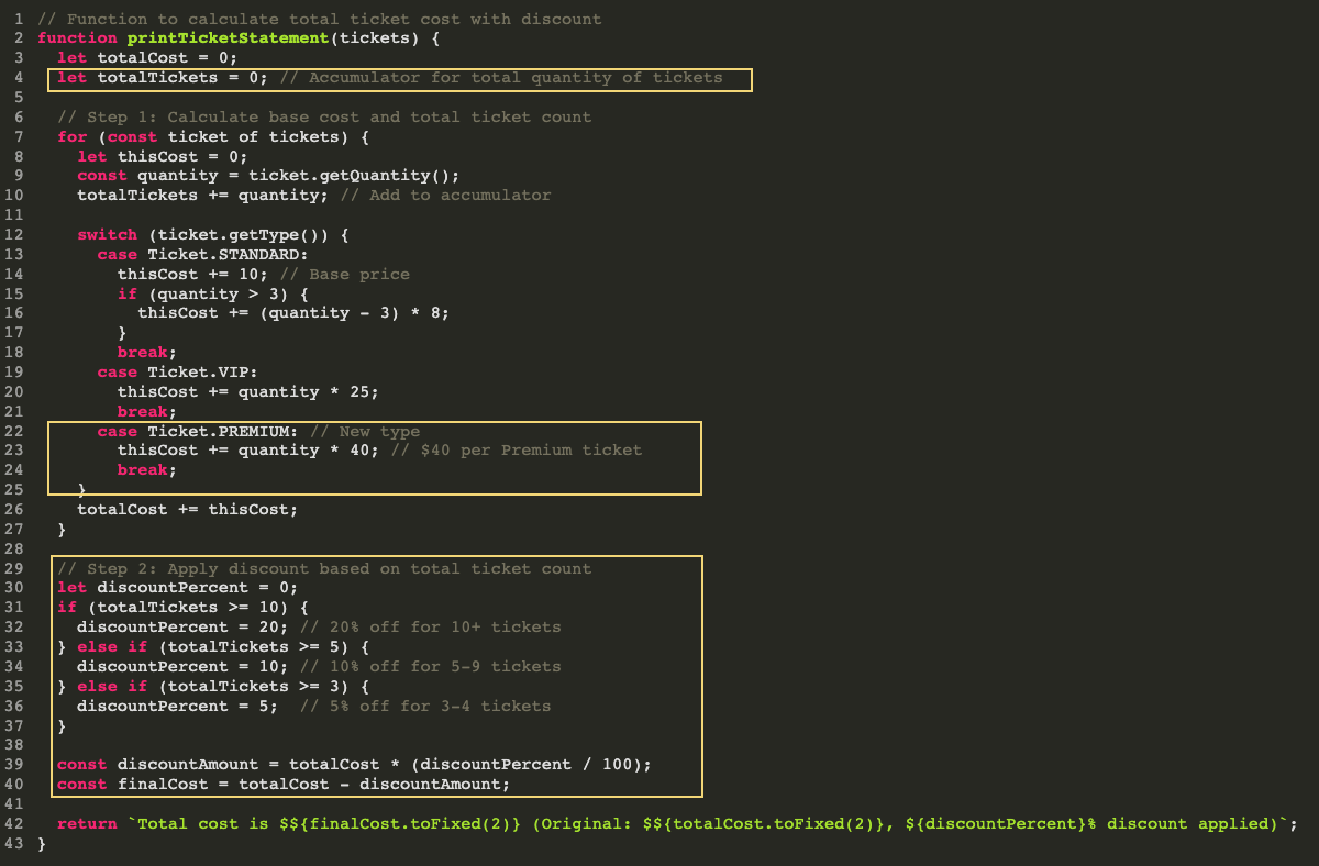 let totalTickets = 0; // Accumulator for total quantity of tickets