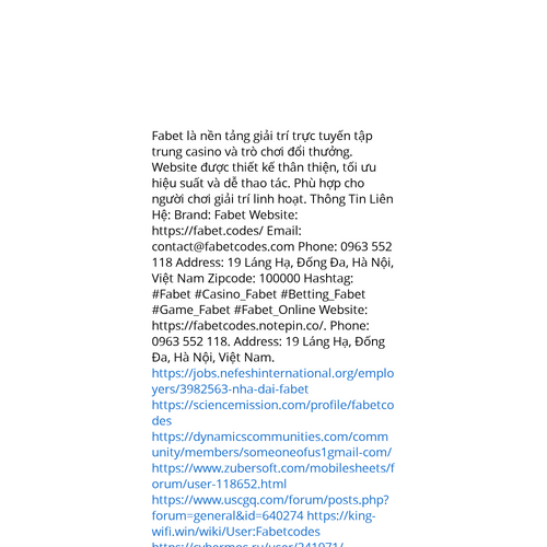 Website: https://fabetcodes.notepin.co/. Fabet là nền tảng giải trí trực tuyến tập trung casino và trò chơi đổi thưởng. Website được thiết kế thân thiện, tối ưu hiệu suất và dễ thao tác. Phù hợp cho người chơi giải trí linh hoạt. Thông Tin Liên Hệ: