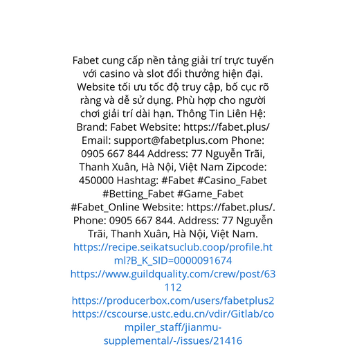 Website: https://fabet.plus/. Fabet cung cấp nền tảng giải trí trực tuyến với casino và slot đổi thưởng hiện đại. Website tối ưu tốc độ truy cập, bố cục rõ ràng và dễ sử dụng. Phù hợp cho người chơi giải trí dài hạn. Thông Tin Liên Hệ: Brand: Fabet