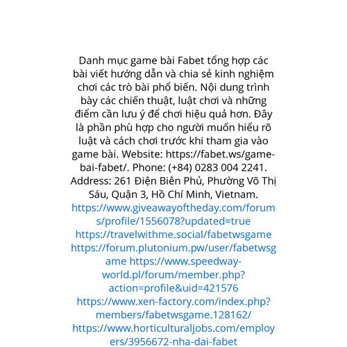 Website: https://fabet.ws/game-bai-fabet/. Danh mục game bài Fabet tổng hợp các bài viết hướng dẫn và chia sẻ kinh nghiệm chơi các trò bài phổ biến. Nội dung trình bày các chiến thuật, luật chơi và những điểm cần lưu ý để chơi hiệu quả hơn. Đây là ph