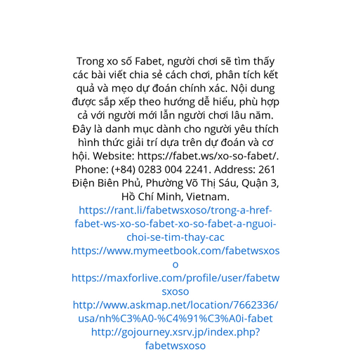 Website: https://fabet.ws/xo-so-fabet/. Trong xo số Fabet, người chơi sẽ tìm thấy các bài viết chia sẻ cách chơi, phân tích kết quả và mẹo dự đoán chính xác. Nội dung được sắp xếp theo hướng dễ hiểu, phù hợp cả với người mới lẫn người chơi lâu năm. Đ