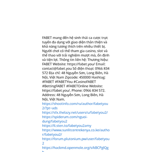 Website: https://fabet.you/https://fabet.you/ FABET mang đến hệ sinh thái ca cược trực tuyến đa dạng với giao diện thân thiện và khả năng tương thích trên nhiều thiết bị. Người chơi có thể tham gia casino, slot và thể thao với trải nghiệm mượt mà, ổn định và tiện lợi