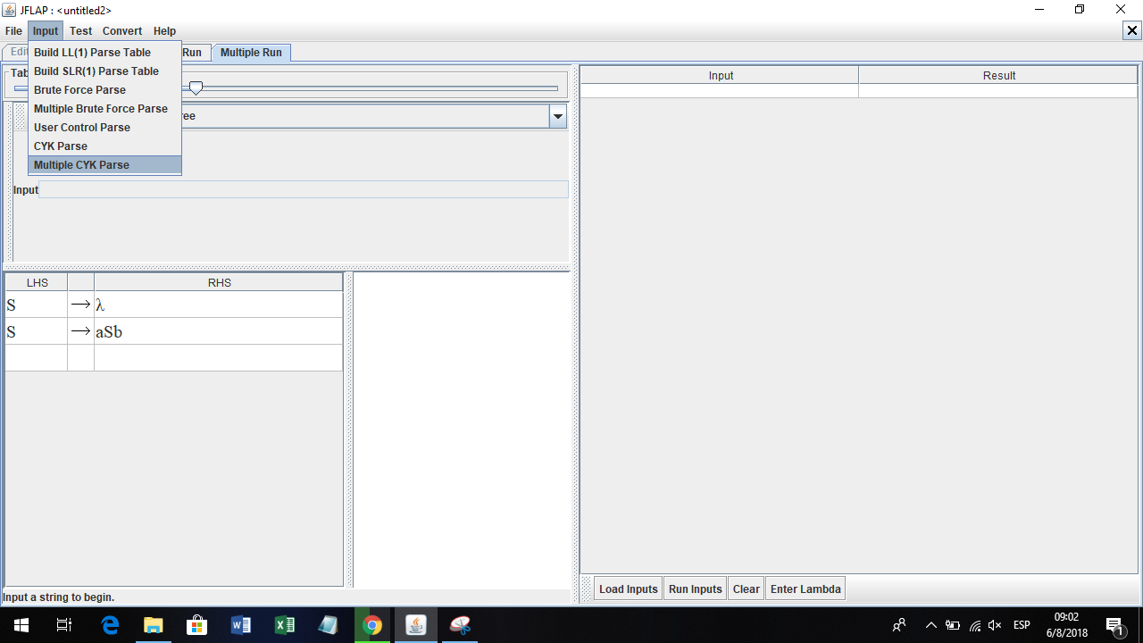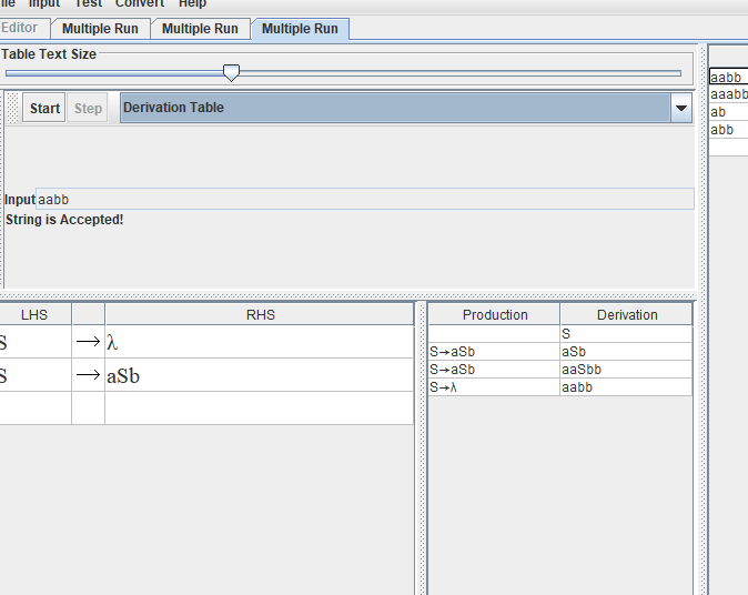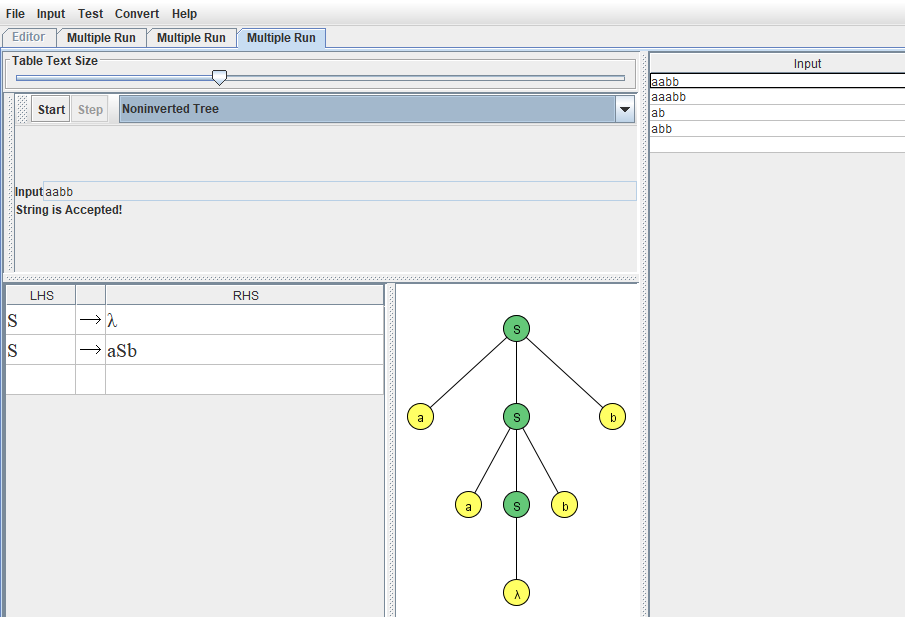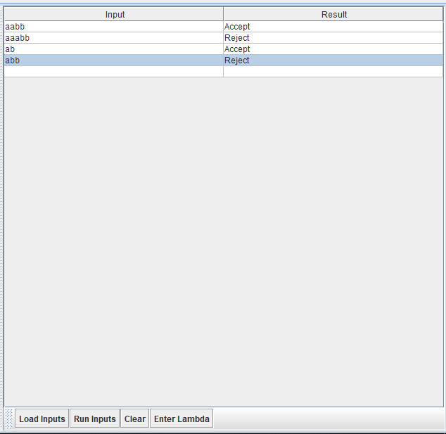 Ingresamos las posibles palabras y presionamos Run Inputs , nos mostrará si la palabra es aceptada o rechazada