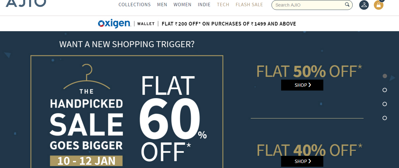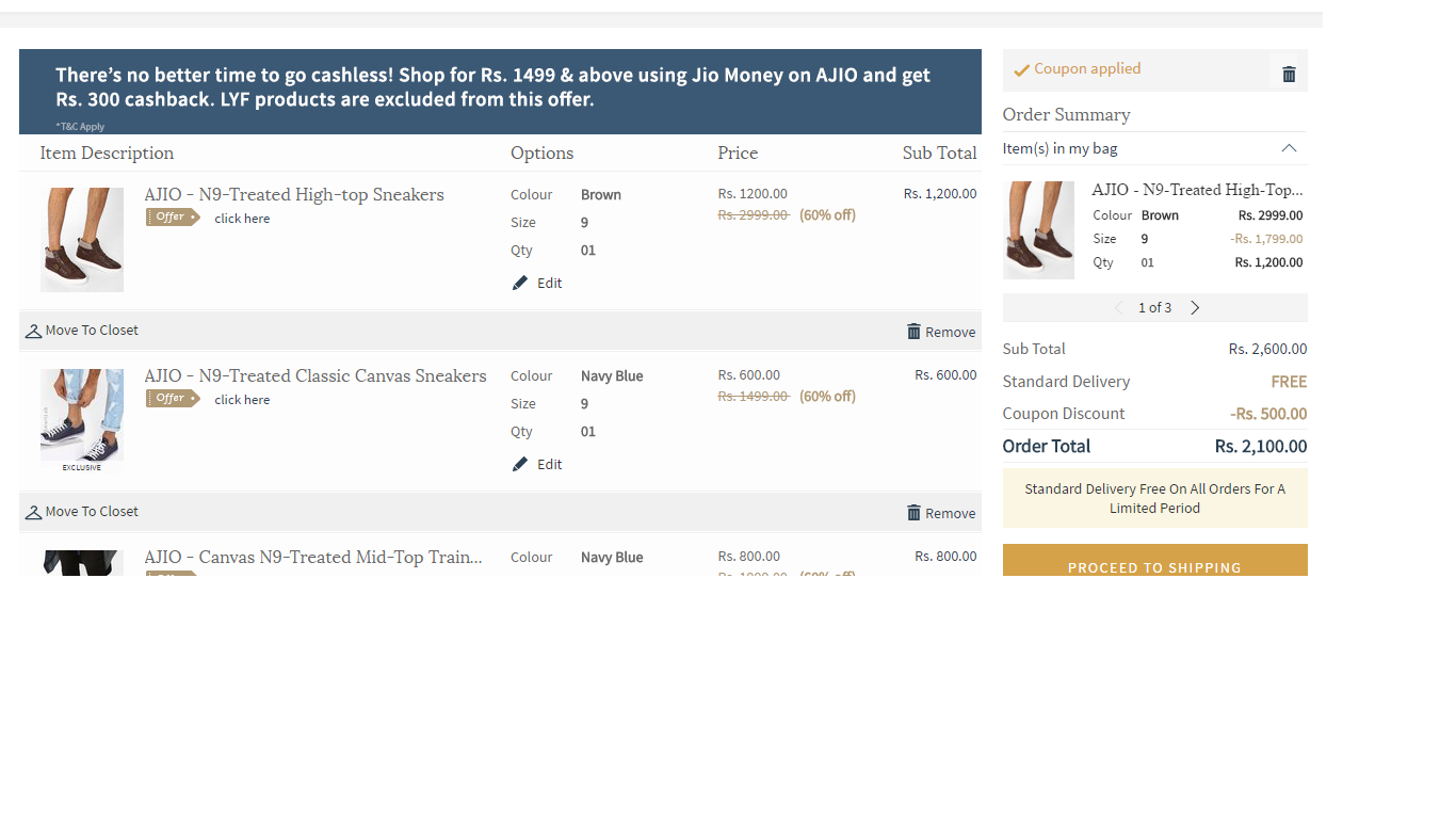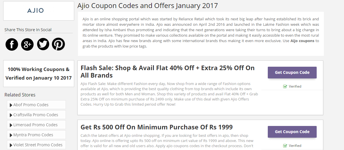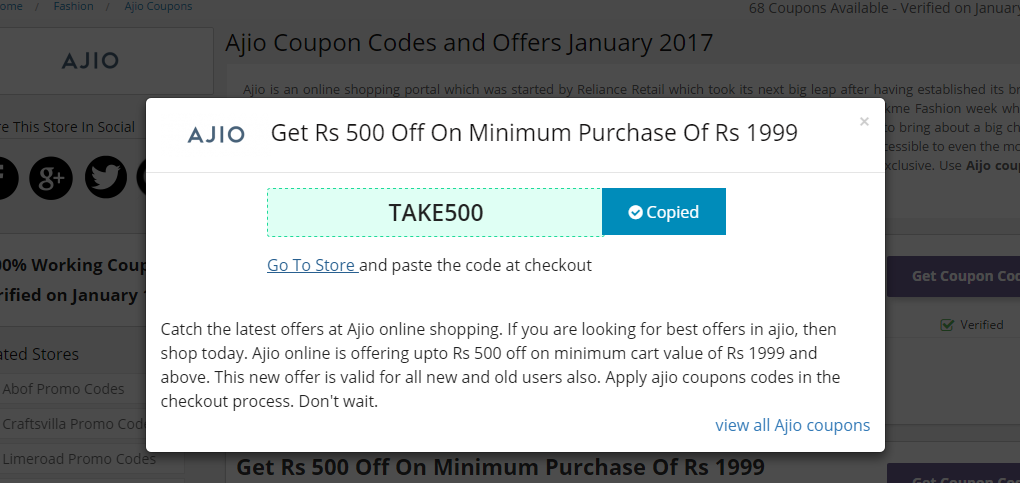 Now, you are logged into the ajio coupon codes and deals list page. Scroll down and check among the list of coupons and deals on all fashion brands and accessories etc . Click on to the ‘Show the Coupon Code’ option present beside Select the Coupon Code.Use this Coupons and will get discount.