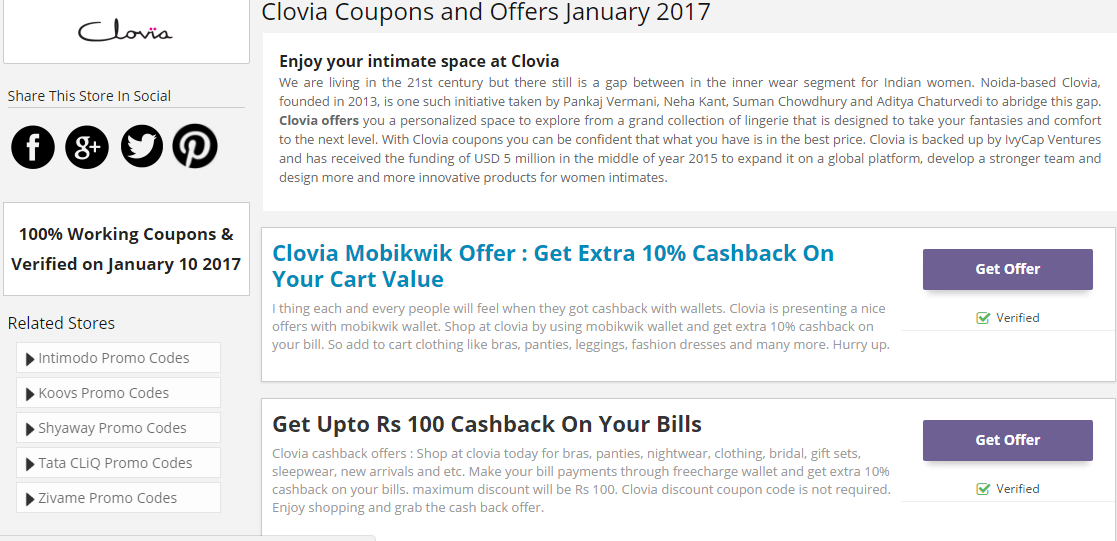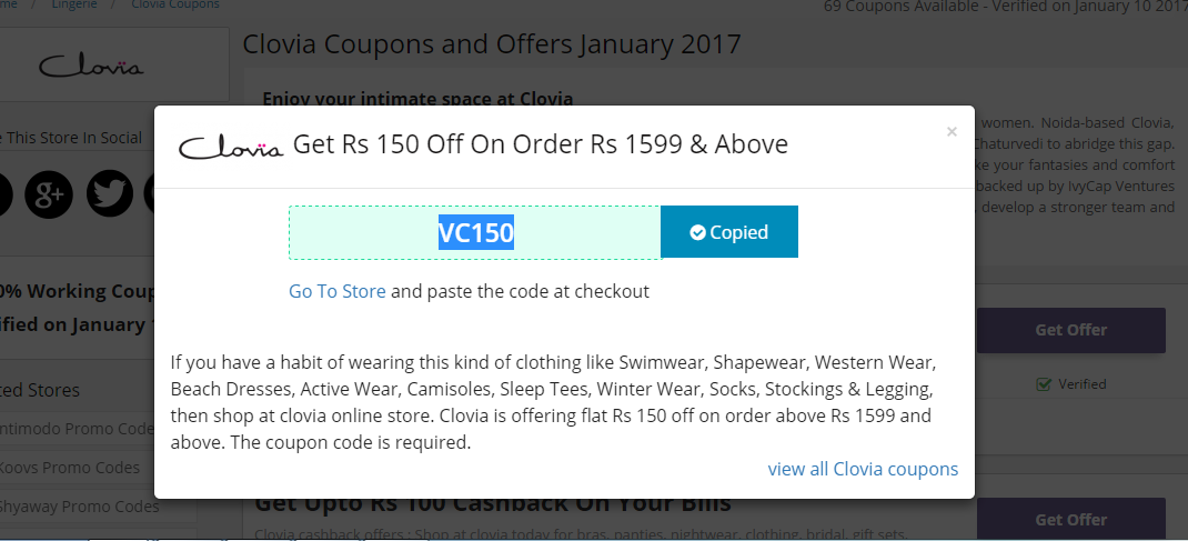 Now, you are logged into the Clovia coupons and deals list page. Scroll down and check among the list of coupons and deals on Lingerie Items like Bras, Panties, Night Wear etc . Click on to the ‘Show the Coupon Code’ option present beside Select the Coupon Code.Use the Coupons and will get cashback.