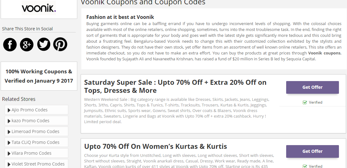 Visit voonik and grab daily Coupons of all type of Kurtis, kurtas, sarees all over India. It has lots of coupons available for saving money on online shopping. Checkout the best choice of yours a great discounts, deals and offers through Fabpromocodes Coupon Site.