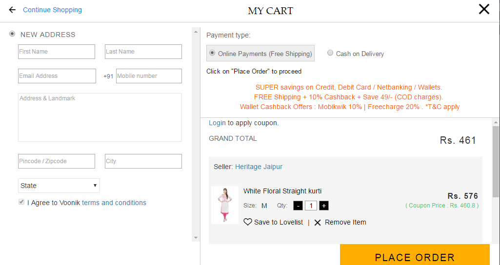 Now, after selecting you order then click to proceed button after payment gateway page will display .the cashback offers will display .That’s it! Enjoy with cashback on voonik fashion.