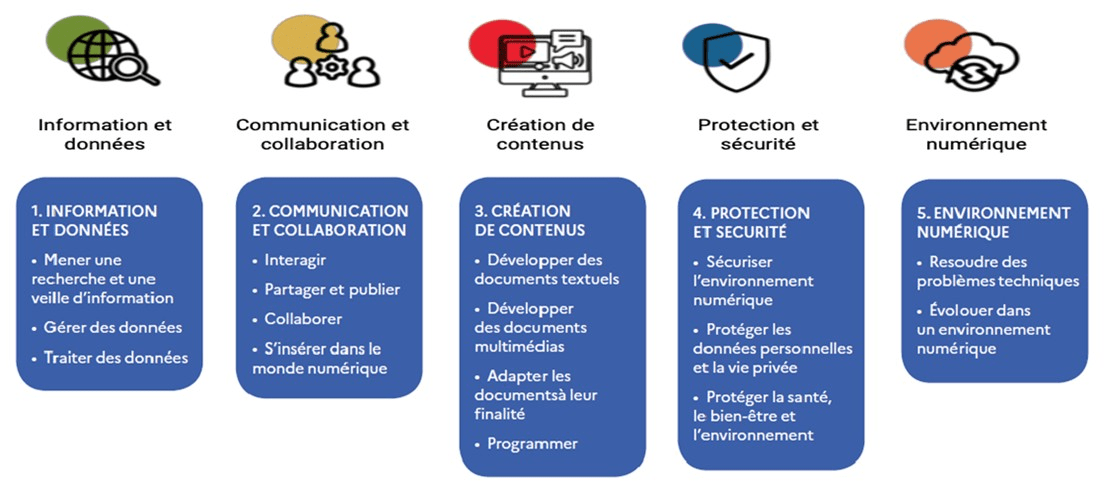 Le document répertorie les 5 grands domaines avec les 19 compétences que les enseignants doivent maitriser pour enseigner de manière optimale avec une pédagogie intégrant un usage pertinent du numérique.