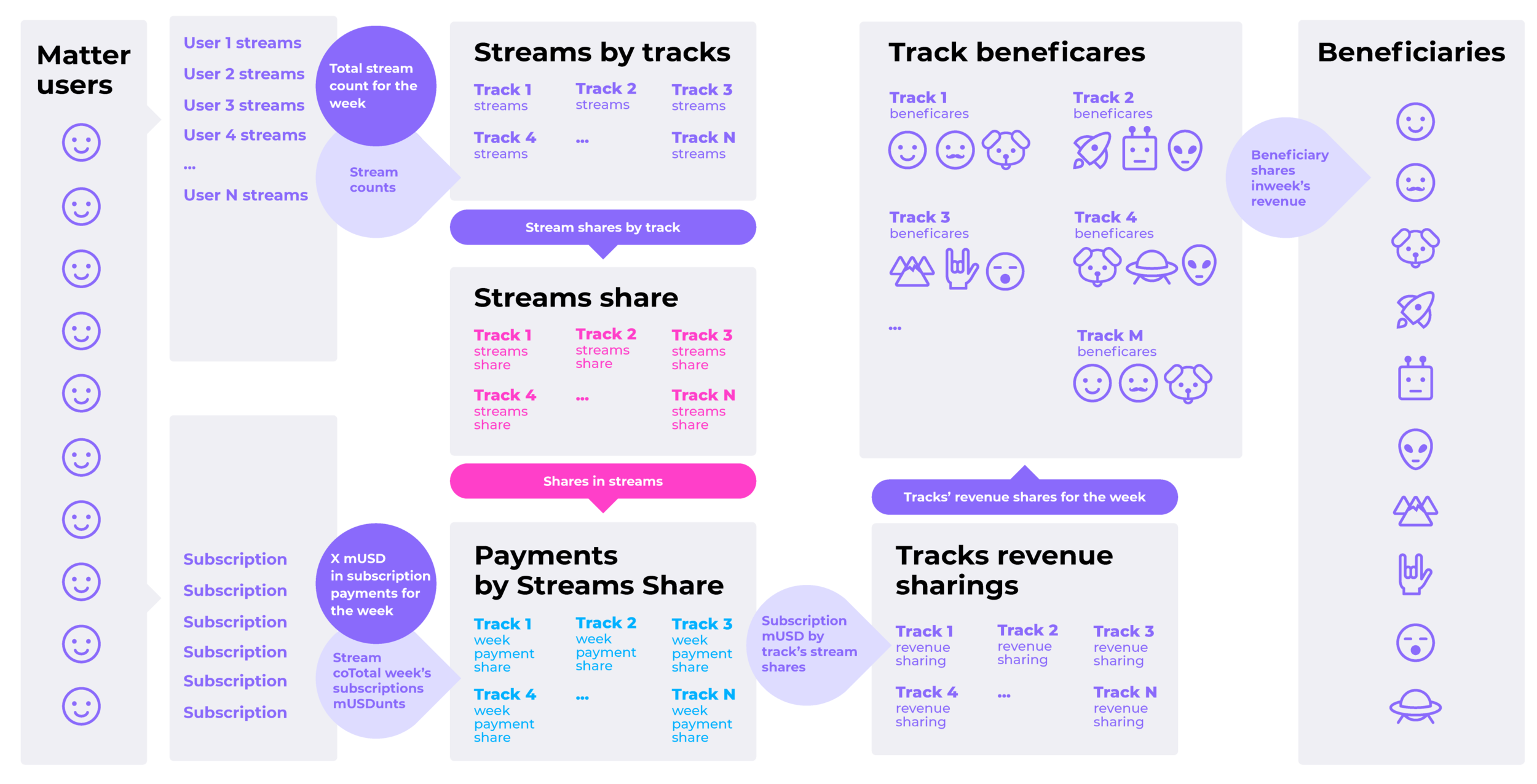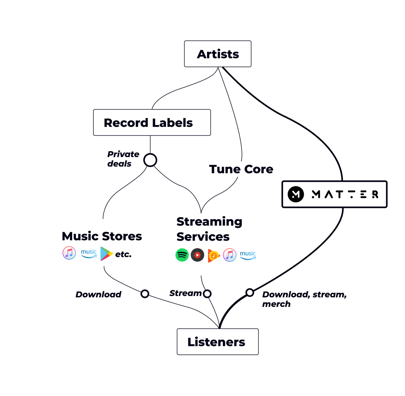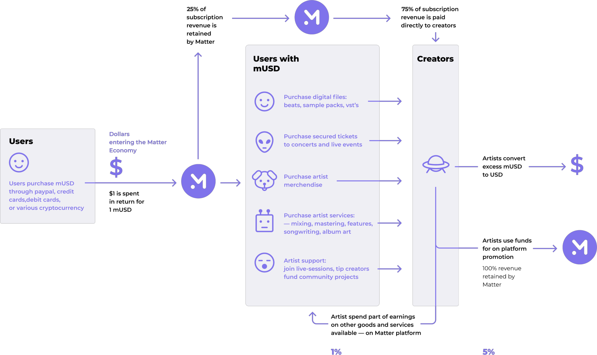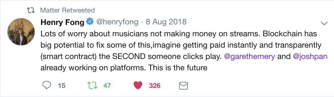 Matter provides a frictionless transfer of value between artists and listeners, automating all third party interactions, and removing cross platform engagement slippage