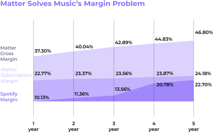 Matter can actually pay labels and artists more, giving them a massive financial incentive to use Matter’s platform rather than established incumbents.