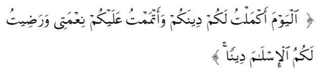 “Pada hari ini telah Ku-sempurnakan untukmu agamamu, dan telah Ku-cukupkan padamu ni’mat-Ku dan telah Ku-ridhai Islam sebagai agama bagimu.” (QS. Al Maidah: 3).