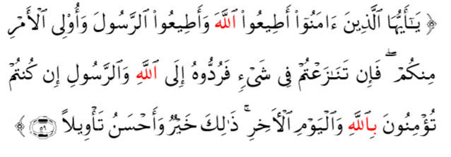 “Hai orang-orang yang beriman, taatilah Allah dan taatilah Rasul (Nya), dan Ulil Amri (pemimpin) diantara kamu, kemudian jika kamu berlainan pendapat tentang sesuatu, maka kembalikanlah ia kepada Allah (Al-Quran) dan Rasulnya (Al Hadist) jika kamu benar-benar beriman kepada Allah dan hari kemudian. Yang demikian itu adalah lebih utama (bagimu) dan lebih baik akibatnya.”(QS. An nisa: 59).