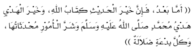 “Amma ba’du, sesungguhnya sebaik-baik perkataan adalah Kitab Allah (Al-Quran) dan sebaik-baiknya petunjuk adalah petunjuk Muhammad shallallahu ‘alaihi wa sallam, dan sejelek-jeleknya perbuatan (dalam agama) adalah yang diada-adakan, dan setiap bid’ah itu sesat.” (HR. Muslim).