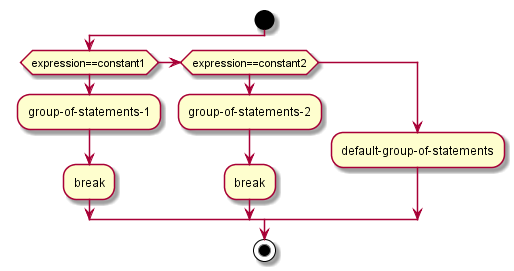 它按以下方式工作:switch计算expression并检查它是否等于constant1; 如果是,则执行group-of-statements-1直到找到break语句。 当它找到这个break语句时,程序跳转到整个switch语句的结尾(结束括号)。
