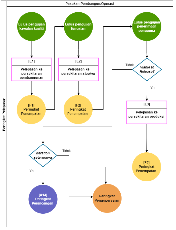 Pada peringkat pelepasan, penetapan versi perlu dilaksanakan untuk digunakan pada peringkat penempatan. Peringkat pelepasan melibatkan 3 persekitaran utama iaitu: