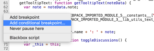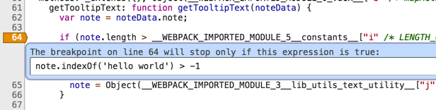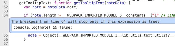 console.timeEnd(label); getTooltipText: 0.051025390625ms console.table(data); console.trace(); monitor(fnName); debug(fnName); $0, $1, $2Conditional Breakpoints
