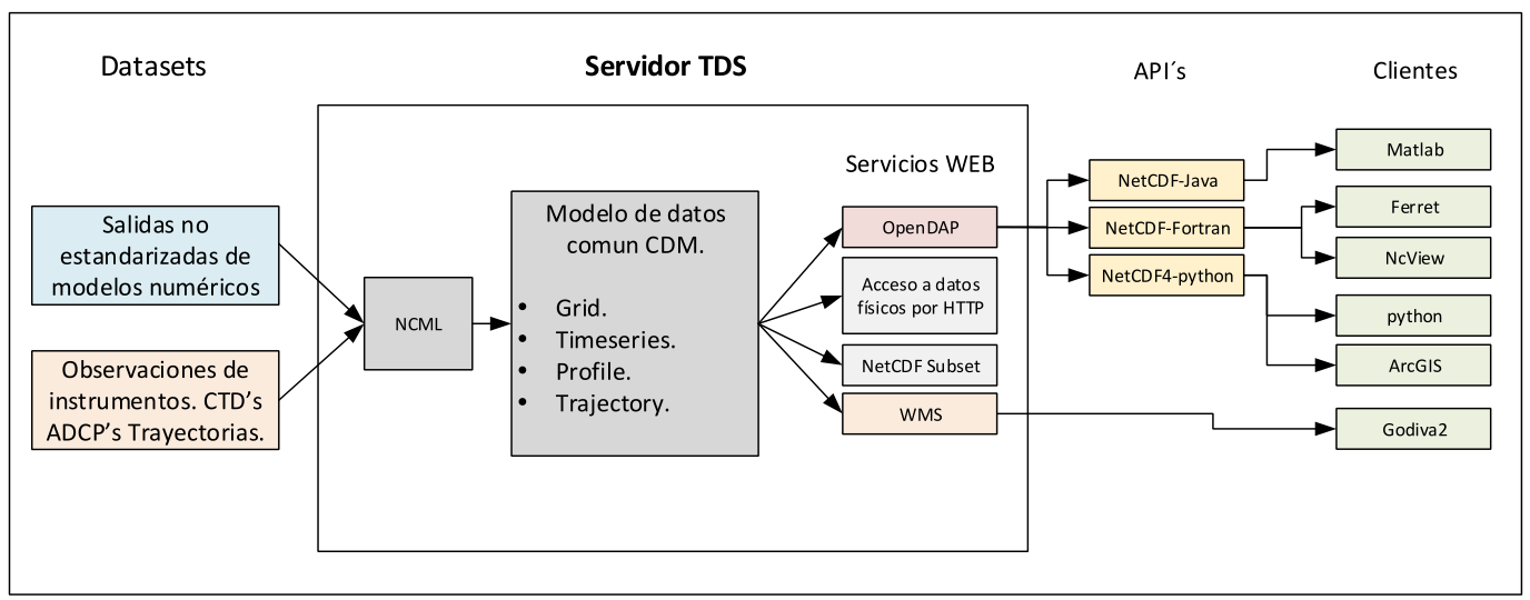Rápida presentación sobre los estandares para el almacenamiento descripción y distribución de datos geo-referenciados, explorando los frameworks NetCDF+CF+Thredds y el sistema ERDDAP como bases para la construcción de interfases personalizadas.