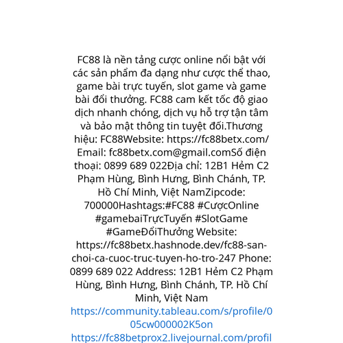Website: https://fc88betx.hashnode.dev/fc88-san-choi-ca-cuoc-truc-tuyen-ho-tro-247 FC88 là nền tảng cược online nổi bật với các sản phẩm đa dạng như cược thể thao, game bài trực tuyến, slot game và game bài đổi thưởng. FC88 cam kết tốc độ giao dịch n