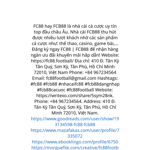 Website: https://writexo.com/share/5sym28nk. FC88 hay FCB88 là nhà cái cá cược uy tín top đầu châu Âu. Nhà cái FCB88 thu hút được nhiều lượt khách nhờ các sản phẩm cá cược như: thể thao, casino, game bài,... Đăng ký ngay FC88 | FCB88 để nhận hàng ngà