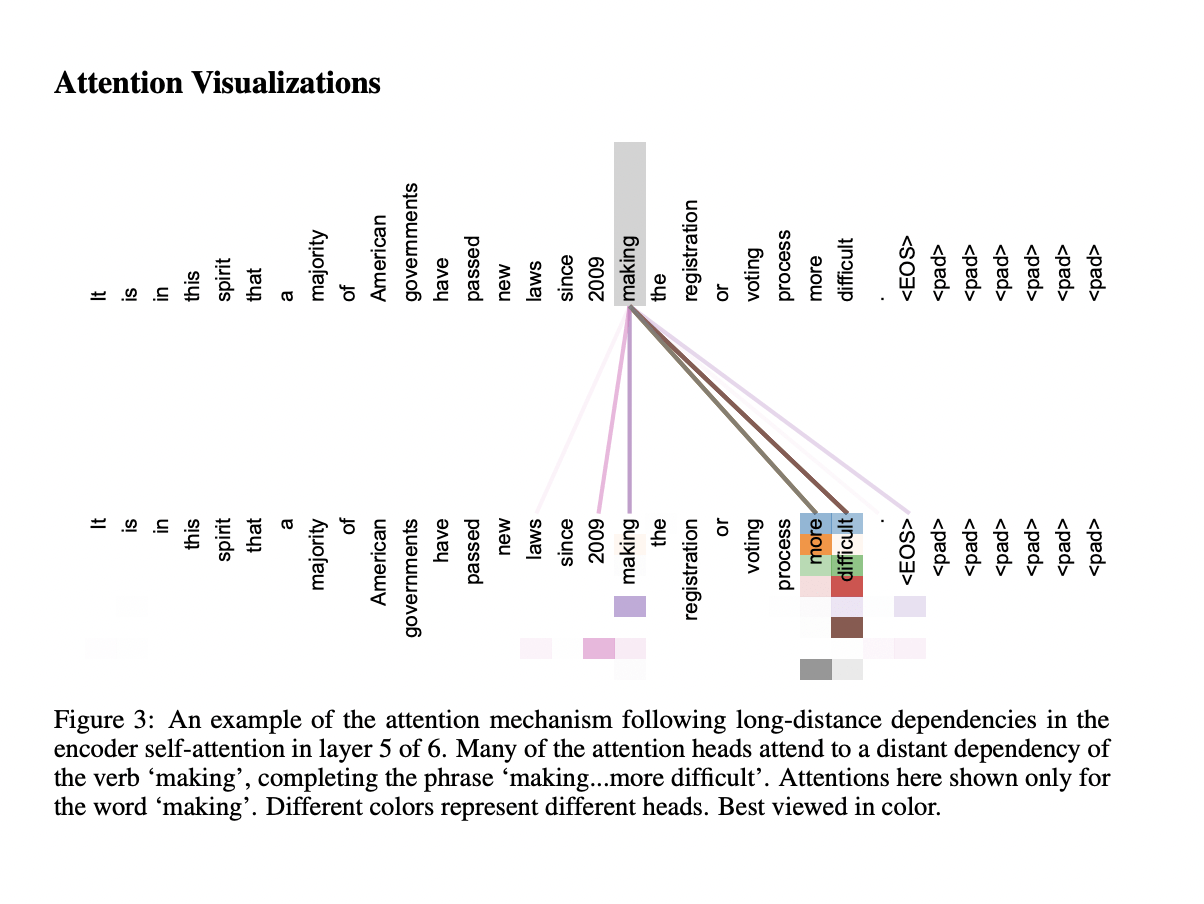 each attention head learns relationships between elements of the series (i.e. words/punctuation in the sentence)