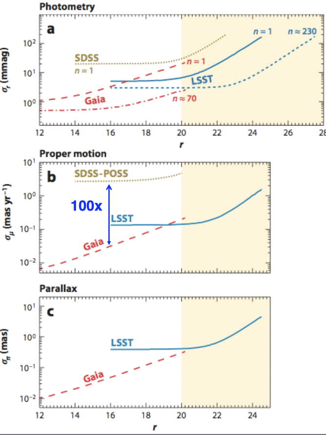 In the context of Gaia, the LSST can be thought of as its deep complement (for a detailed discussion, we refer the reader to IBJ2012). Gaia will provide an all-sky catalog with unsurpassed trigonometric parallax, proper-motion, and photometric measurements to r∼20, for about 1 billion stars. The LSST will extend the static map to r∼27 over half of the sky, detecting about 20 billion stars.
