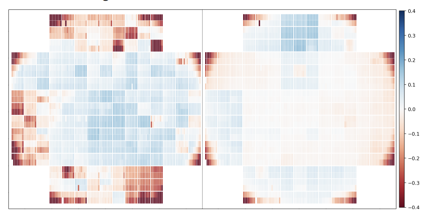 𝑢 (left) and 𝑦 band (right) magnitude corrections associated with read-noise, QE, and vignetting effects for each amplifier in the CCD plane.