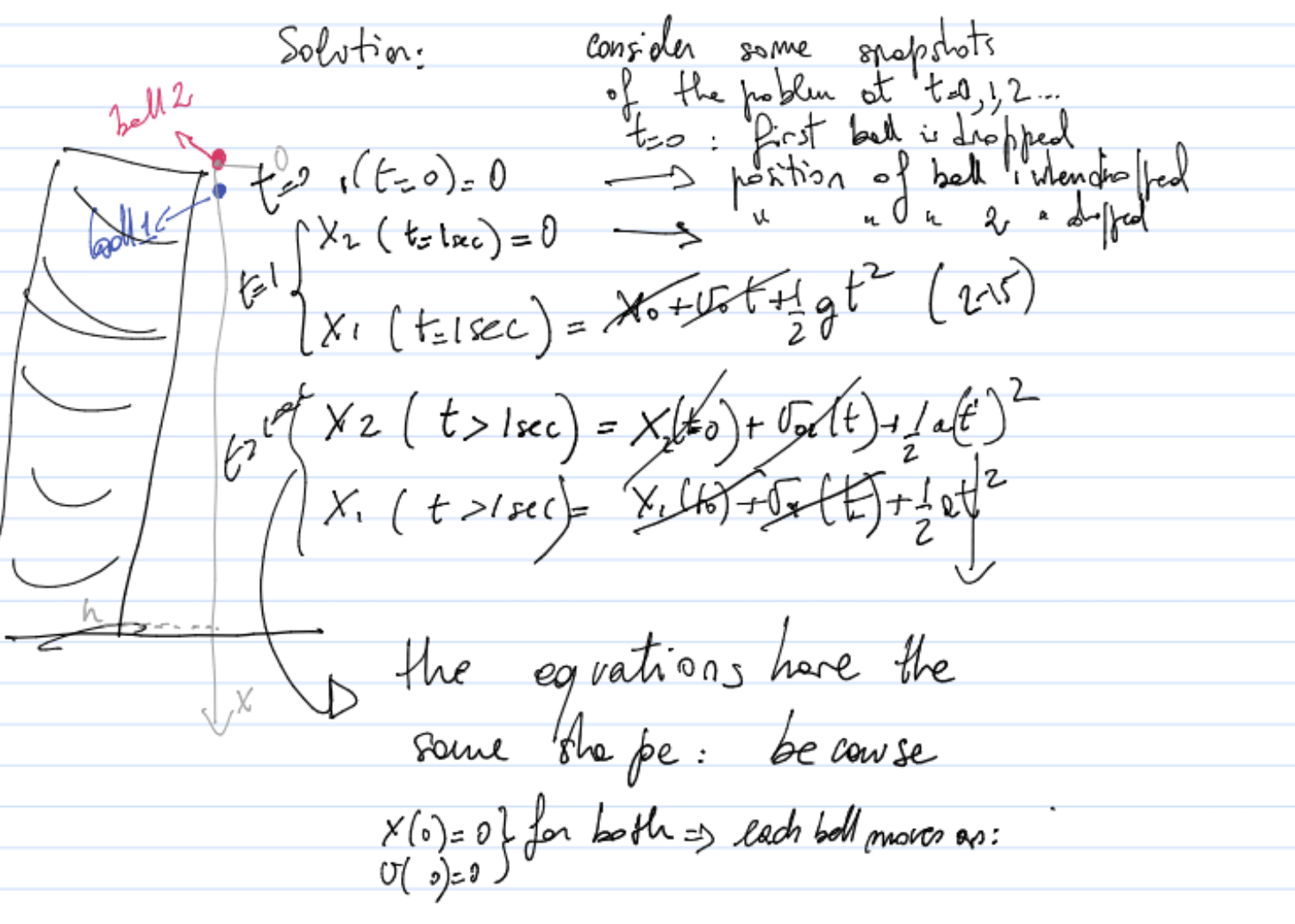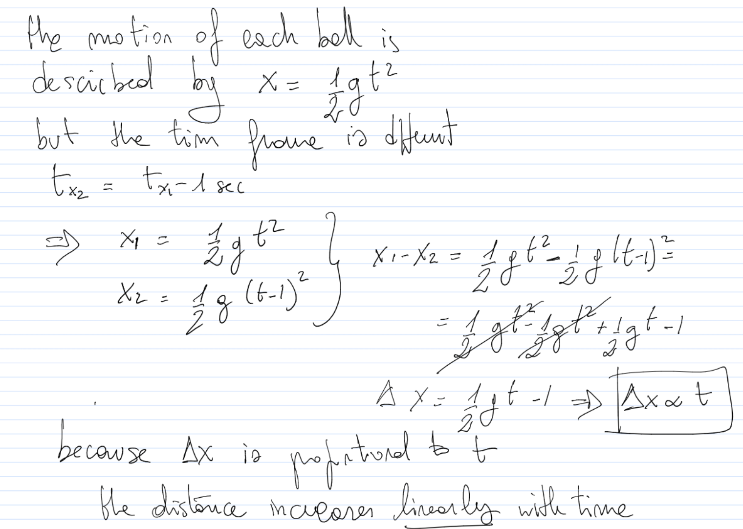 Two identical objects are dropped from the Tower of Pisa 1 second apart. What happens to the distance between the 2 balls during the