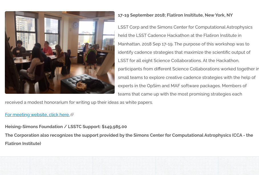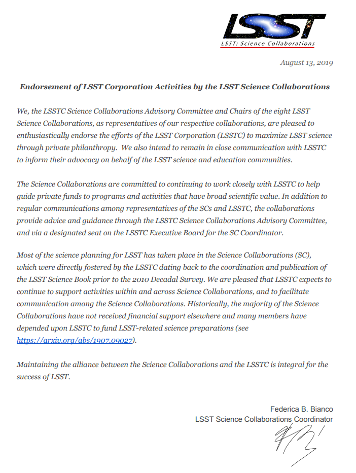 The Science Collaborations are committed to continuing to work closely with LSSTC to help guide private funds to programs and activities that have broad scientific value. Click here for the Letter of Endorsement of LSST Corporation by the LSST Science Collaborations.