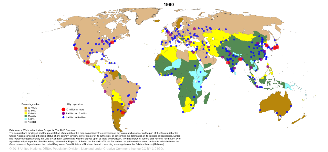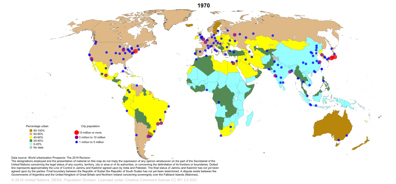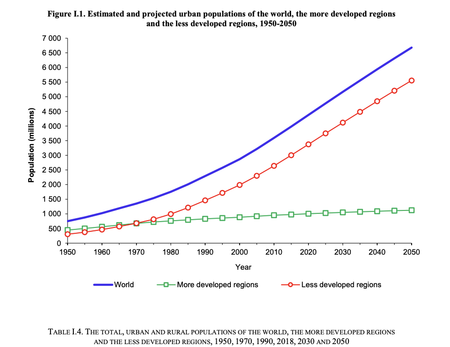 As a consequence, by 1970 the urban population of the less developed regions had surpassed that of the more developed regions (680 million versus 674 million), and the difference increased rapidly thereafter. [...] By 2050, with 5.6 billion urban dwellers, the less developed regions are projected to have 83 per cent of the world’s urban population and 87 per cent of the total world population.