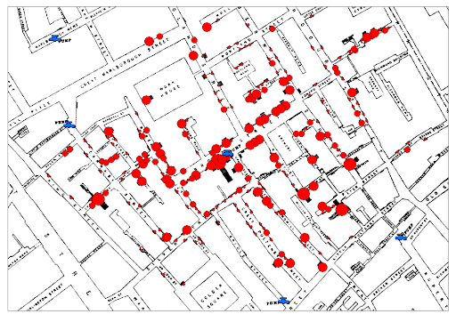 A Cholera Map shows clustering - generally referred to as the first example of data science