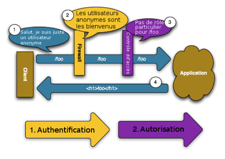 firewalls : configuration des pare-feux, technique d'authentification formulaire ...), paramètres des routes login, logout, utilisateur anonyme autorisé etc ...