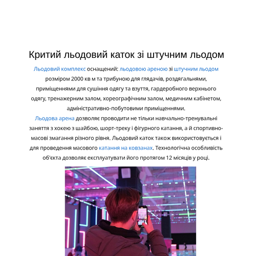 https://fifty-ice.com https://www.instagram.com/fifty.ice/ https://www.facebook.com/fiftyice/ Льодовий комплекс оснащений: льодовою ареною зі штучним льодом розміром 2000 кв м та трибуною для глядачів, роздягальнями, приміщеннями для сушіння одягу т