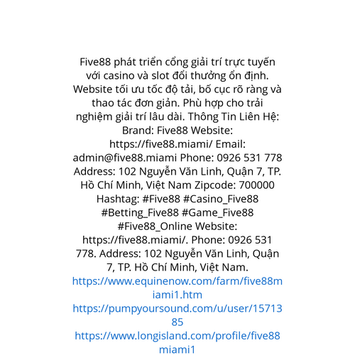 Website: https://five88.miami/. Five88 phát triển cổng giải trí trực tuyến với casino và slot đổi thưởng ổn định. Website tối ưu tốc độ tải, bố cục rõ ràng và thao tác đơn giản. Phù hợp cho trải nghiệm giải trí lâu dài. Thông Tin Liên Hệ: Brand: Fiv