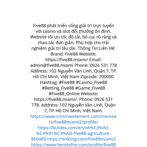 Website: https://five88.miami/. Five88 phát triển cổng giải trí trực tuyến với casino và slot đổi thưởng ổn định. Website tối ưu tốc độ tải, bố cục rõ ràng và thao tác đơn giản. Phù hợp cho trải nghiệm giải trí lâu dài. Thông Tin Liên Hệ: Brand: Fiv