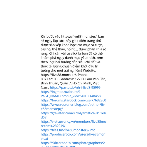 Website: https://five88.monster/. Khi bước vào https://five88.monster/, bạn sẽ ngay lập tức thấy giao diện trang chủ được sắp xếp khoa học: các mục ca cược, casino, thể thao, nổ hũ… được phân chia rõ ràng. Chỉ cần vài cú click là bạn đã có thể khám p