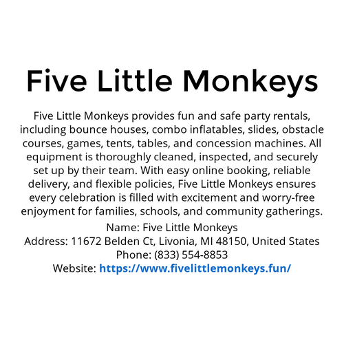 https://www.fivelittlemonkeys.fun/ Five Little Monkeys delivers bounce houses, slides, tents, games & concessions with safe, clean rentals and easy booking for stress-free parties.