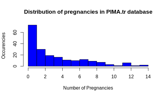 ylab = "Occurencies", main = "Distribution of pregnancies in PIMA.tr database",col = 'blue')
