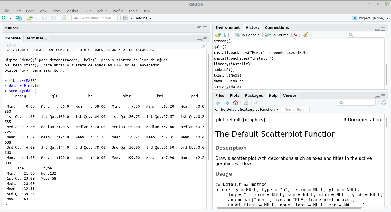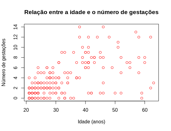 main="Relação entre a idade e o número de gestações",col="red")Mais comandos interessantes: http://mathesaurus.sourceforge.net/octave-r.html - http://www.cookbook-r.com/