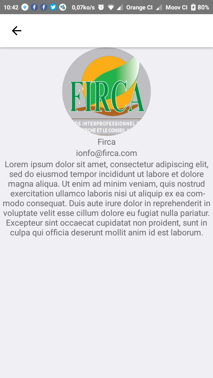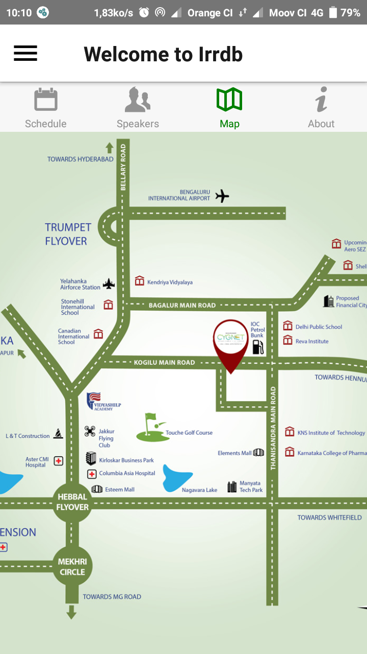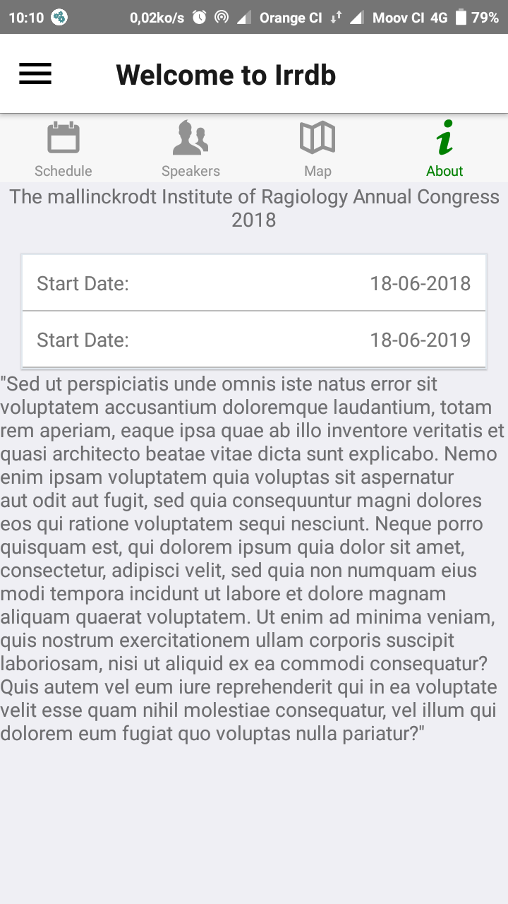 The About screen presents general information about the conference from its start-end dates and description to contact email and location. One tap actions for opening the device mailer with a pre-defined email already set and launching the map application installed on the device with the exact location allow the users to contact the conference organisers and get directions with a single move.