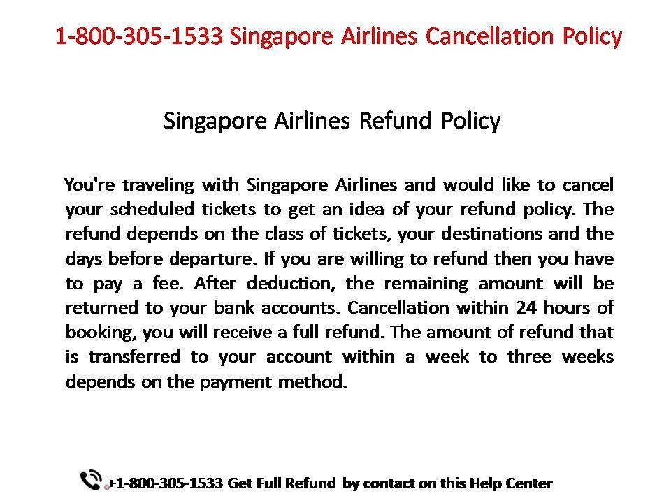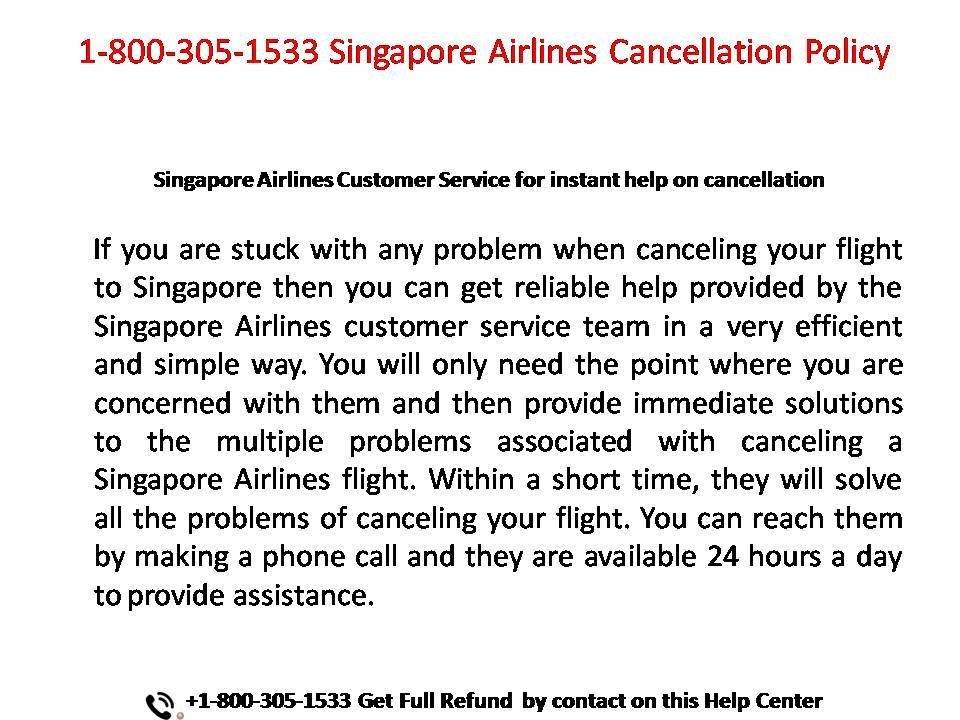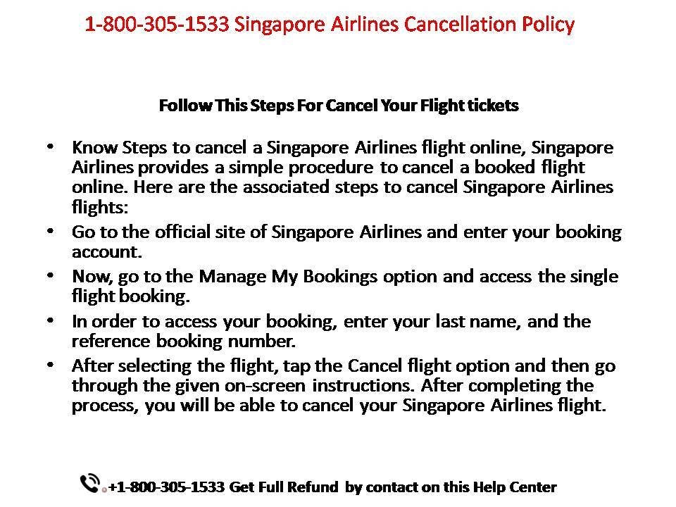 1(800)305-1533 Know all about Singapore Airlines cancellation policy, refund policy, Flight change policy or cancellation fee on flight tickets. Read the given steps and make your Singapore Airlines flight cancellation easy. And Contact the Cancellation help center 24/7 hours.