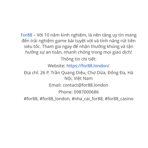 For88 – Với 10 năm kinh nghiệm, là nền tảng uy tín mang đến trải nghiệm game bài tuyệt vời và tính năng rút tiền siêu tốc. Tham gia ngay để nhận thưởng khủng và tận hưởng sự an toàn, nhanh chóng trong mọi giao dịch! Thông tin chi tiết: Website: https://for88.london/ Địa chỉ: 26 P. Trần Quang Diệu, Chợ Dừa, Đống Đa, Hà Nội, Việt Nam Email: contact@for88.london Phone: 0987000686 #for88, #for88_london, #nha_cai_for88, #for88_casino