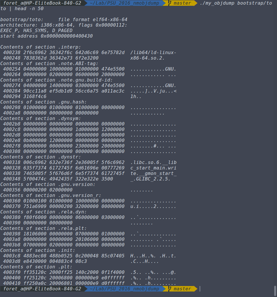 objdump est un utilitaire Unix servant à examiner les fichiers binaires. Il permet d'afficher le contenu des differantes sections d'un fichier binaire.