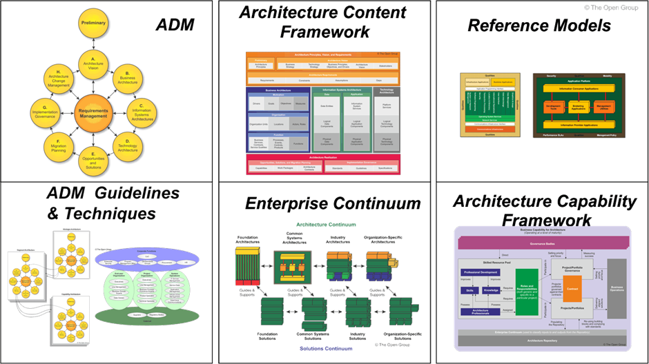 Marcos de referencia de AE: DoDAF, TOGAF, Zachman, entre otros.